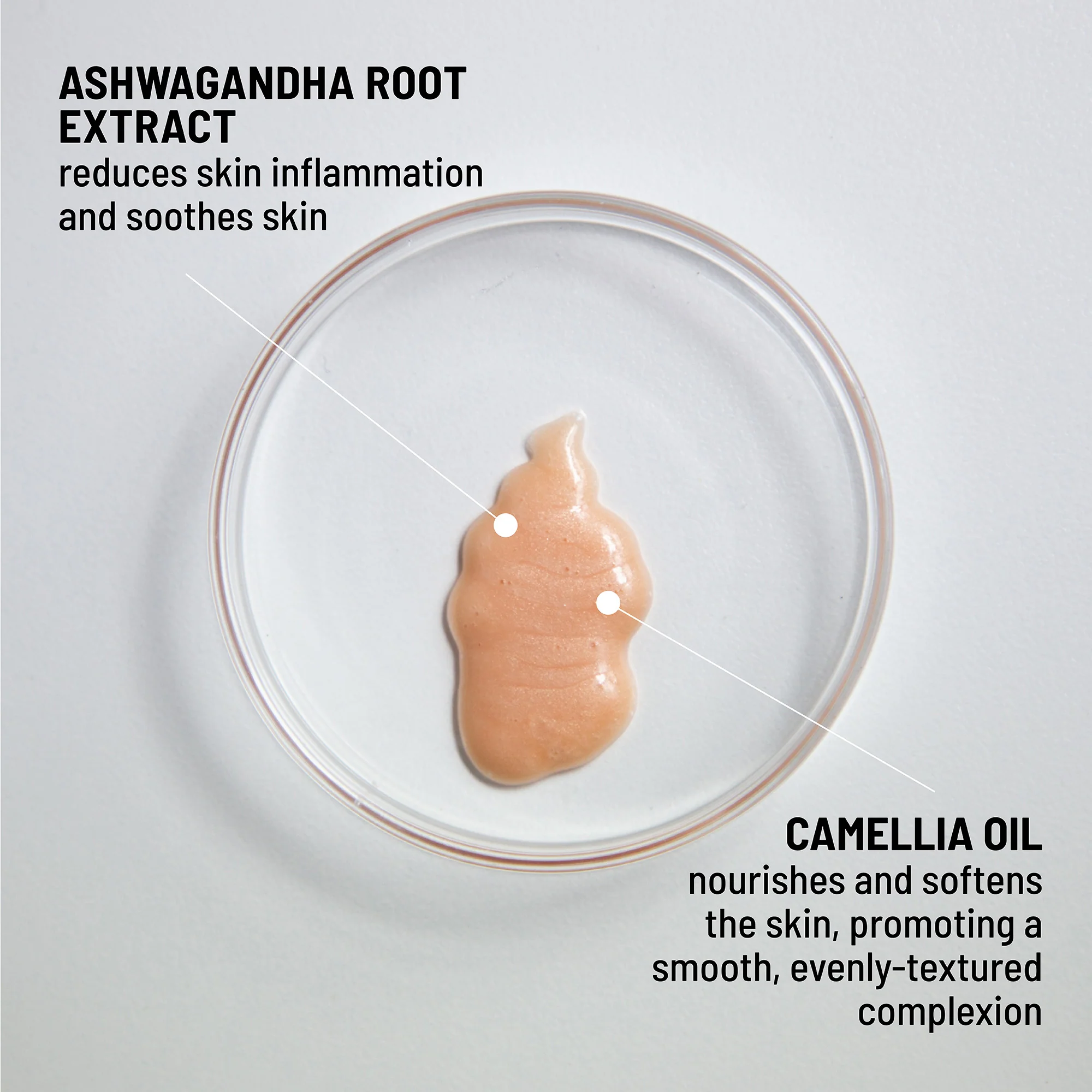 Infused with ashwagandha root extract and camellia oil, this innovative formula delivers antioxidant-rich hydration. Ashwagandha root extract reduces inflammation and skin redness, while camellia oil nourishes and softens the skin, leaving it supple, plump, and noticeably smooth.