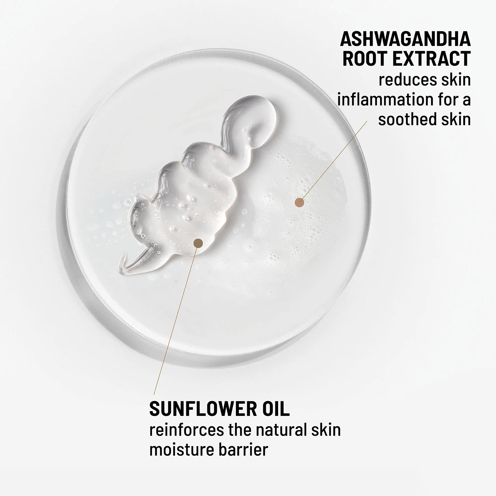 WATER/AQUA/EAU, GLYCERIN, SODIUM COCOYL ALANINATE, DISODIUM COCOAMPHODIACETATE, LAURYL HYDROXYSULTAINE, SODIUM METHYL COCOYL TAURATE, ACRYLATES/C10-30 ALKYL ACRYLATE CROSSPOLYMER, 1-2, HEXANDIOL, SODIUM CHLORIDE, CAPRYLYL GLYCOL, FRAGRANCE (PARFUM), HELIANTHUS ANNUUS (SUNFLOWER) SEED OIL, WITHANIA SOMNIFERA ROOT EXTRACT, OCIMUM SANCTUM LEAF EXTRACT.